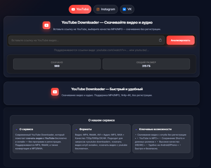 YTGet — это современный онлайн YouTube downloader, который позволяет скачать видео с YouTube бесплатно и без регистрации. Сервис поддерживает все популярные форматы: MP4, WebM, AVI для видео и MP3, M4A, AAC для аудио. Качество загрузки варьируется от 144p до 4K Ultra HD в зависимости от исходного материала.